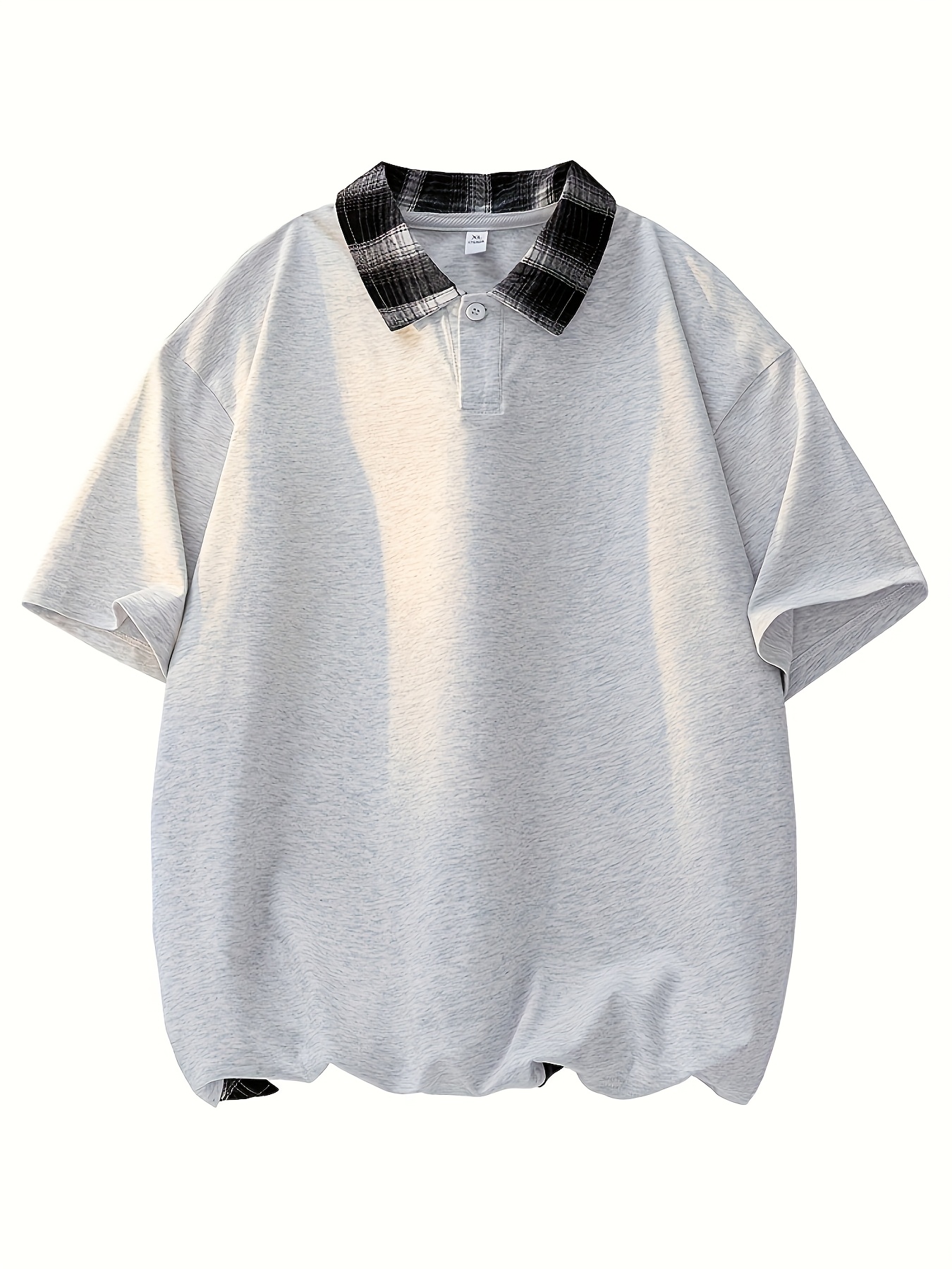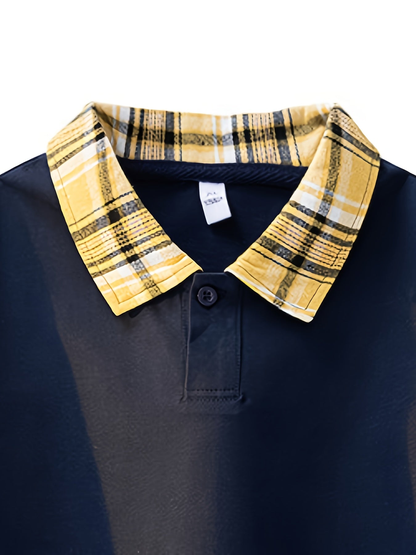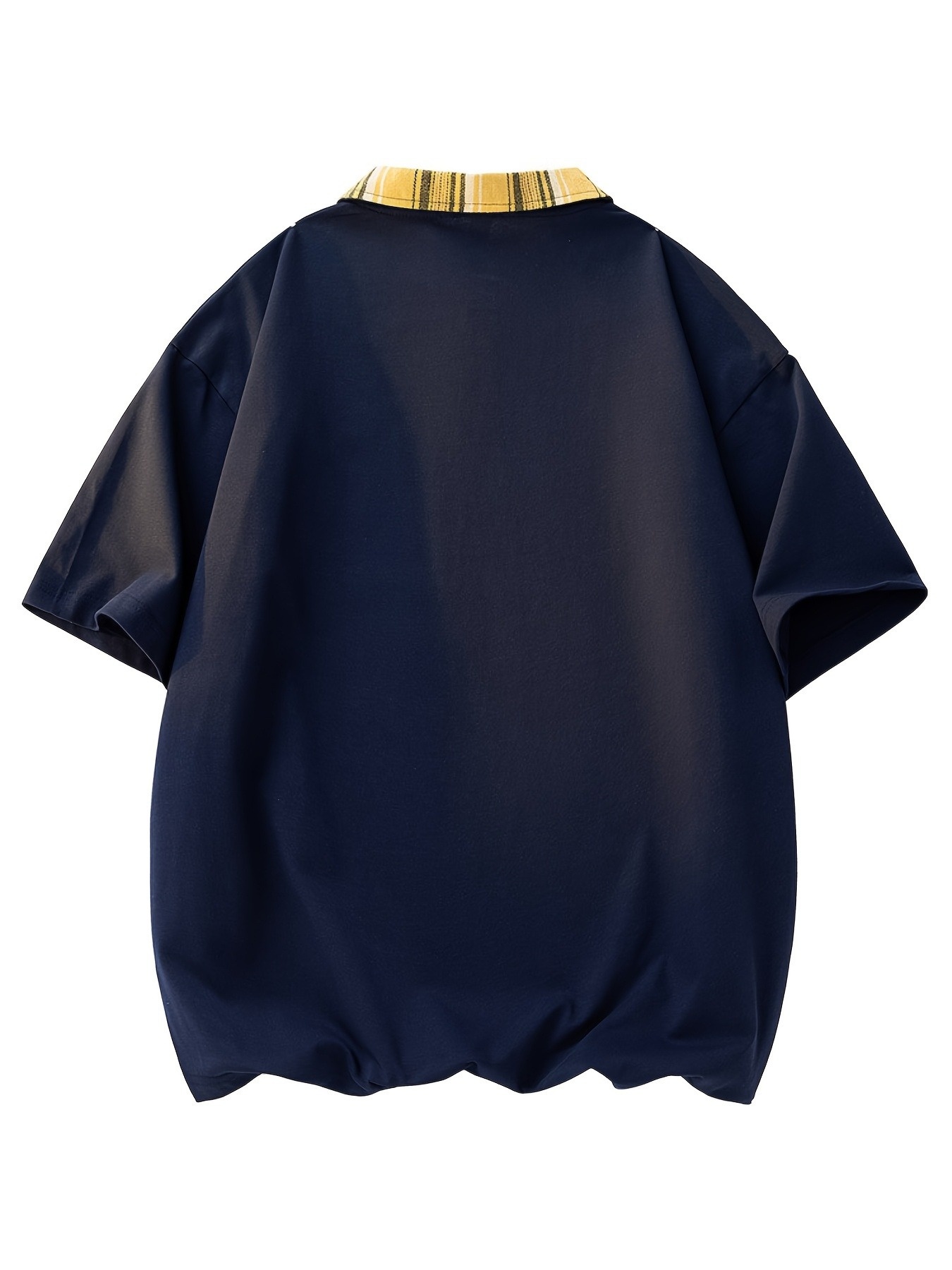 Men'S Casual Color Block Polo Shirt - Short Sleeve, Breathable Polyester, Summer Essential with Yellow and White Check Collar, Relaxed Fit for Weekend Attire, Casual Summer Shirt | Check Pattern Shirt | Polyester Fabric