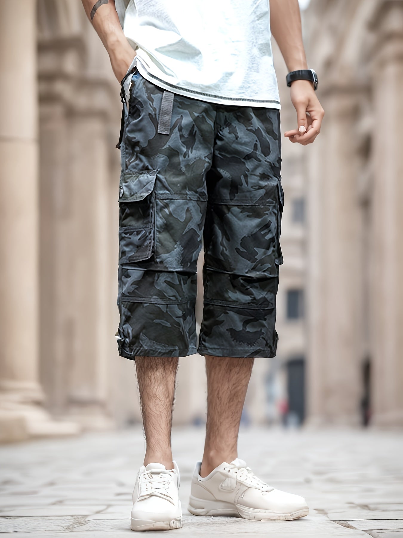 Men'S Outdoor Casual Cargo Shorts with Multiple Pockets, Knee-Length, Featuring an Elastic Waistband And Button Closure, Suitable for Outdoor Adventures, Fishing, Hiking, And Various Outdoor Activities.